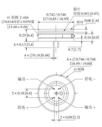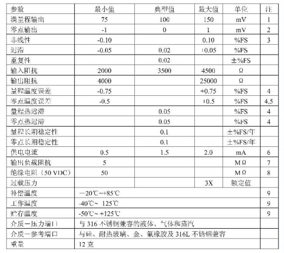 82 型压力传感器是一种经过补偿、且与介质兼容的硅压阻式传感器,其外壳采用19mm外径316不锈钢封装结构。外界压力通过316不锈钢膜片及内部灌充硅油传递到传感器件敏感元件上。82型压力传感器可应用于高性能、低压场合。通过对陶瓷基座上的膜厚电阻进行激光修阻,可以实现对传感器温度补偿及零点偏差调整。陶瓷基底上还提供了一个经激光修正的增益调节电阻使传感器在经过外部差分电路放大后达到统一的输出值,并可控制在±1.0%互换性范围内。