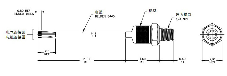 本产品的压力腔采用17-4PH不锈钢单件一体式结构加工而成。其标准压力接口采用1/4NPT外螺纹接头,因而可以保证较好的密封性能。本产品的特点是无○形圈、无焊缝、无硅油或其他有机物,经久耐用。
