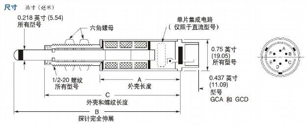 GCA位移传感器:GCA/GCD系列测量头为不锈钢结构,可以在含有湿气、灰尘和其它杂质的环境中工作。电子组件采用了气密封,可以进一步抵御恶劣的工作状况。它们是量程可达±2.0英寸(50毫米)的长行程侧向负载较重型传感器。最大弹力一般为8盎司(226.8克 ),具体取决于探针位置。工作端或探针具有可拆卸的镀铝硬质工具钢4-48UNF-2A螺纹接触端头。Schaevitz提供多种型号的备用接触端头(请参见第92页)。这些端头还可以与AGD刻度盘指示器端头互换使用。