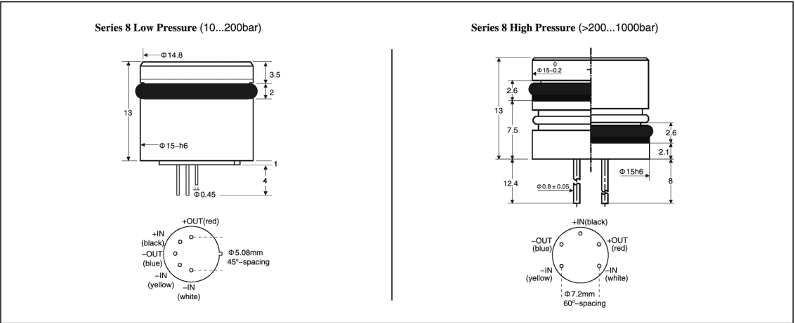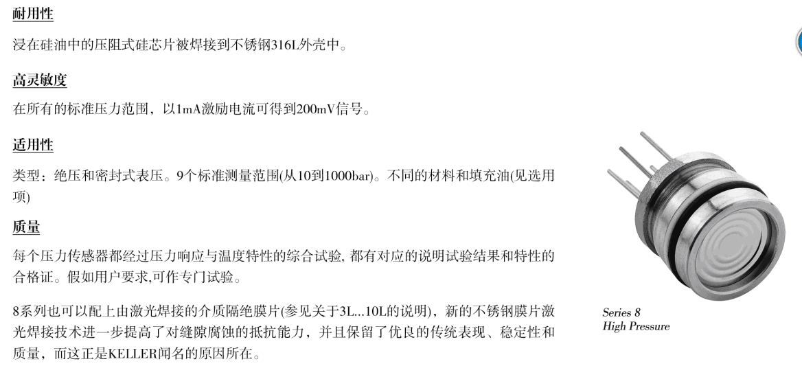 8系列压力传感器十分坚固耐用,即使在受到快速压力峰值影响的情况下。其专用于测量高压。400~1000bar压力范围的8系列用厚的玻璃贯通支架和线焊芯片。