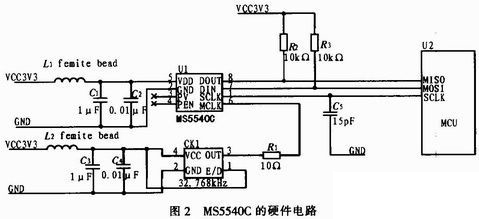 对于32.768 kHz的时钟,不推荐使用晶体或MCU来提供,原因是这种晶体或MCU提高的时钟在宽范围温度条件下并不能保证稳定。图中使用工作范围为-40~85℃的有源晶振。时钟晶振的电源与MS5540C相同,并且需要1~10μF之间的滤波电容及1个0.01~0.1 nF之间的去耦电容,并且通过磁珠消除高频噪声。晶振输出端最好加10~33 Ω的匹配电阻。M5540C的电源端必须认真处理,如图2所示,通过增加磁珠消除高频噪声,1μF和0.01μF电容实现滤波和去耦。PCB布局时,0.01μF电容尽量靠近VDD引脚。