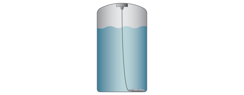 使用投入式压力传感器从放置传感器隔离膜的储罐底部或测量点进行连续压力测量,可以确定液位。 如果压力传感器位于测量范围的底部,例如置于储罐底部,则压力与它正上方的液体高度成正比。如果储罐为通风式,也可以将压力传感器配置为通气表压测量类型,通过电缆中的通风管来校正气压变化。