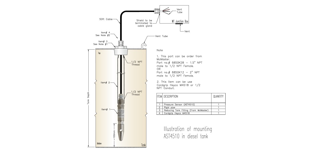 在考虑如何安装投入式压力传感器时,需要考虑多种不同的因素。下面的图示显示了在储罐内使用刚性管安装 AST4510 投入式压力传感器的一种方法。AST4510 在电缆连接基板提供了标准的 1/2" NPT 公端导管连接。如果储罐内因采用入口/加注管或使用搅拌器而使液体涌动,可以为传感器的电缆安装刚性塑料或金属导管,以防传感器在储罐内移动。在船运、铁路运输等移动应用中,或者需要在不同地点之间运输储罐时(例如施工场地使用的燃油储罐、用于工业处理的化学品容器或井场注入化学品),这种形式最为常见。